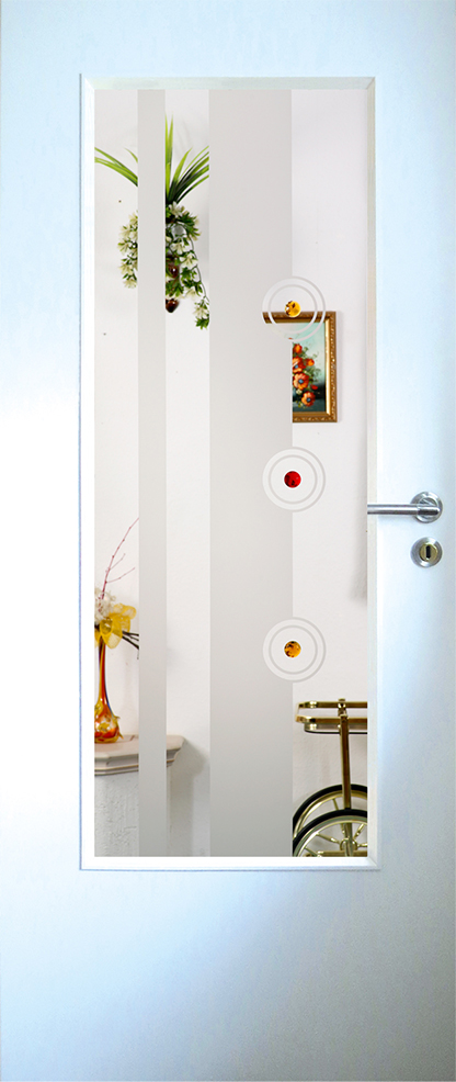 Türscheibe mit sandgestrahlten Elementen sowie verschieden farbigen Muggelsteinen in Farben 97/81).
